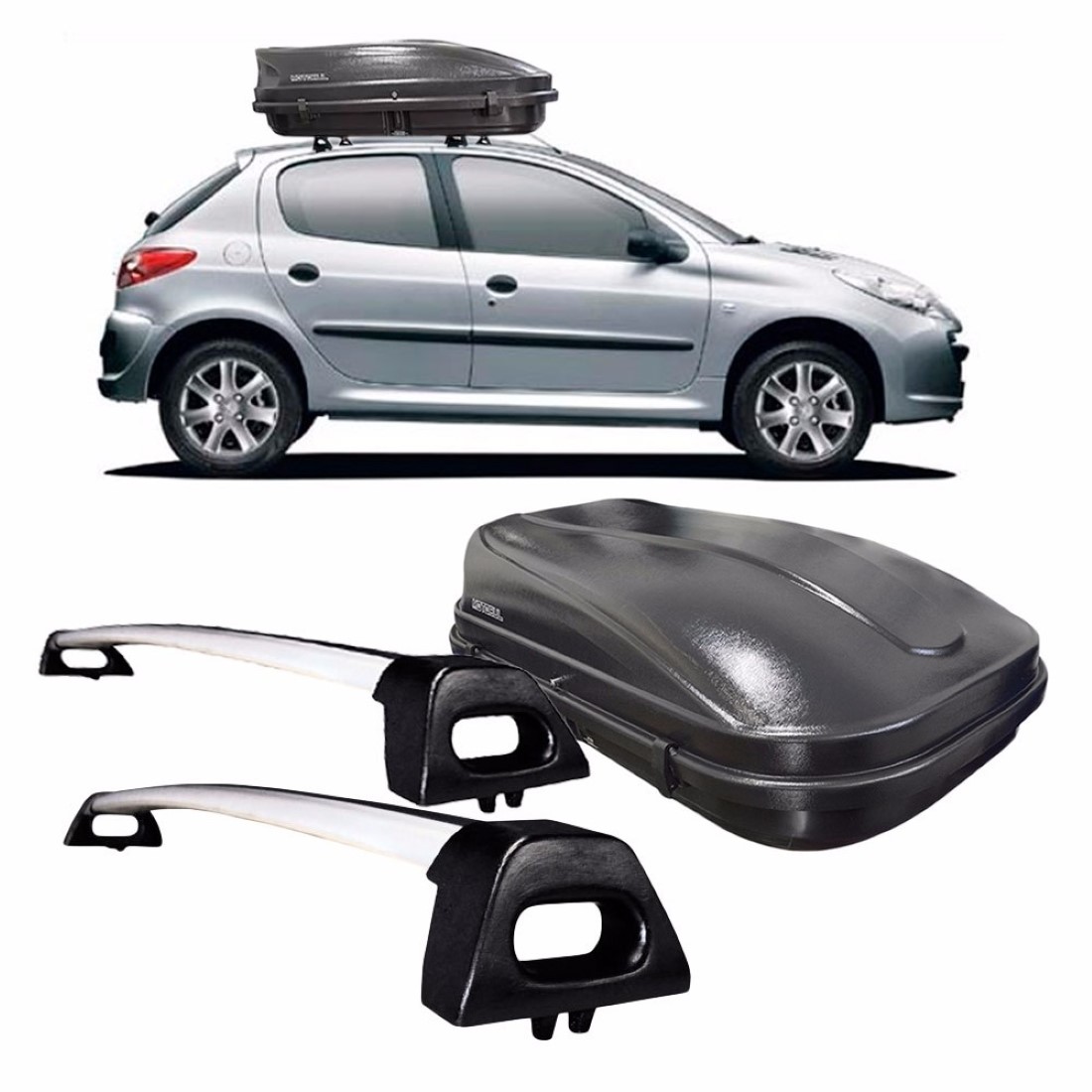 RACK ALUMINIO PEUGEOT 207 PRATA + BAÚ 510 LITROS LIGHT PRETO